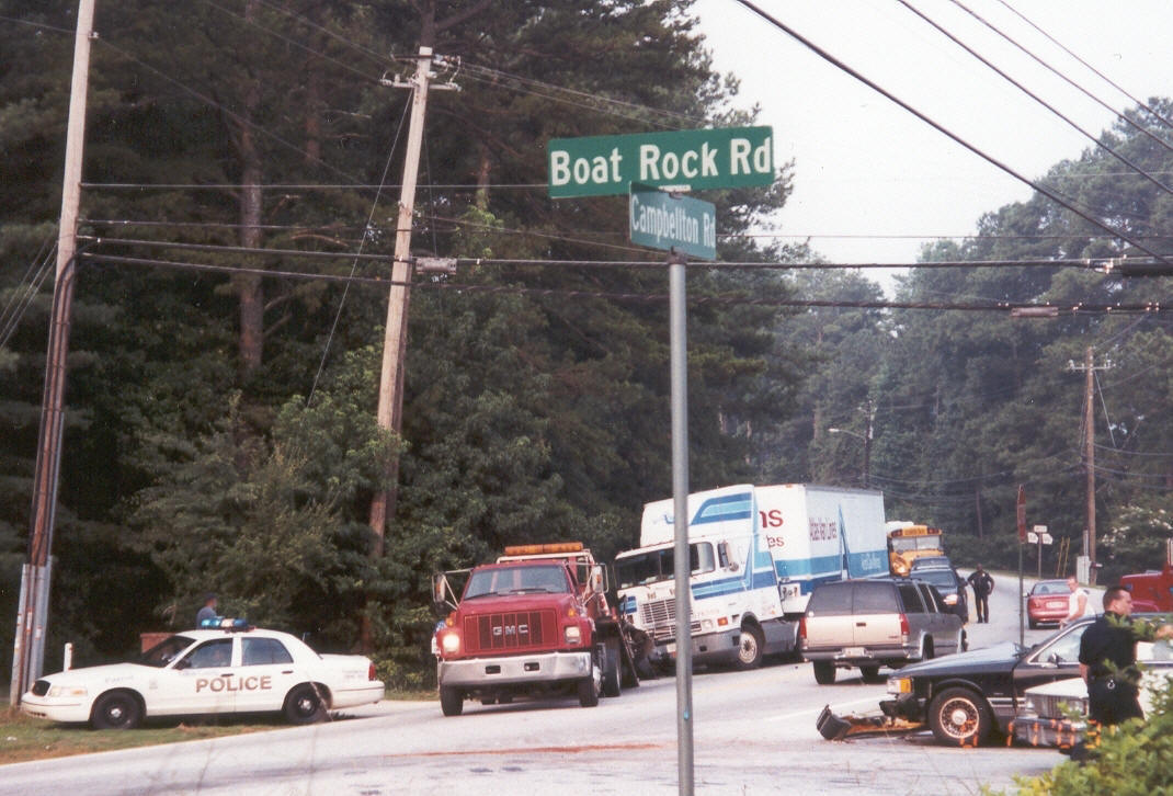 The photo above is from the first day of school in 2003 where an 18-wheeler rear ended a pickup waiting to make a left onto Boat Rock. A few years ago Fulton County presented 5 or so alternative design solutions for the intersection including several round-about designs and traffic signal designs.  A part of all of the alternatives was to re-route New Hope Road 400 feet further away from the intersection to address the backups on New Hope Road.