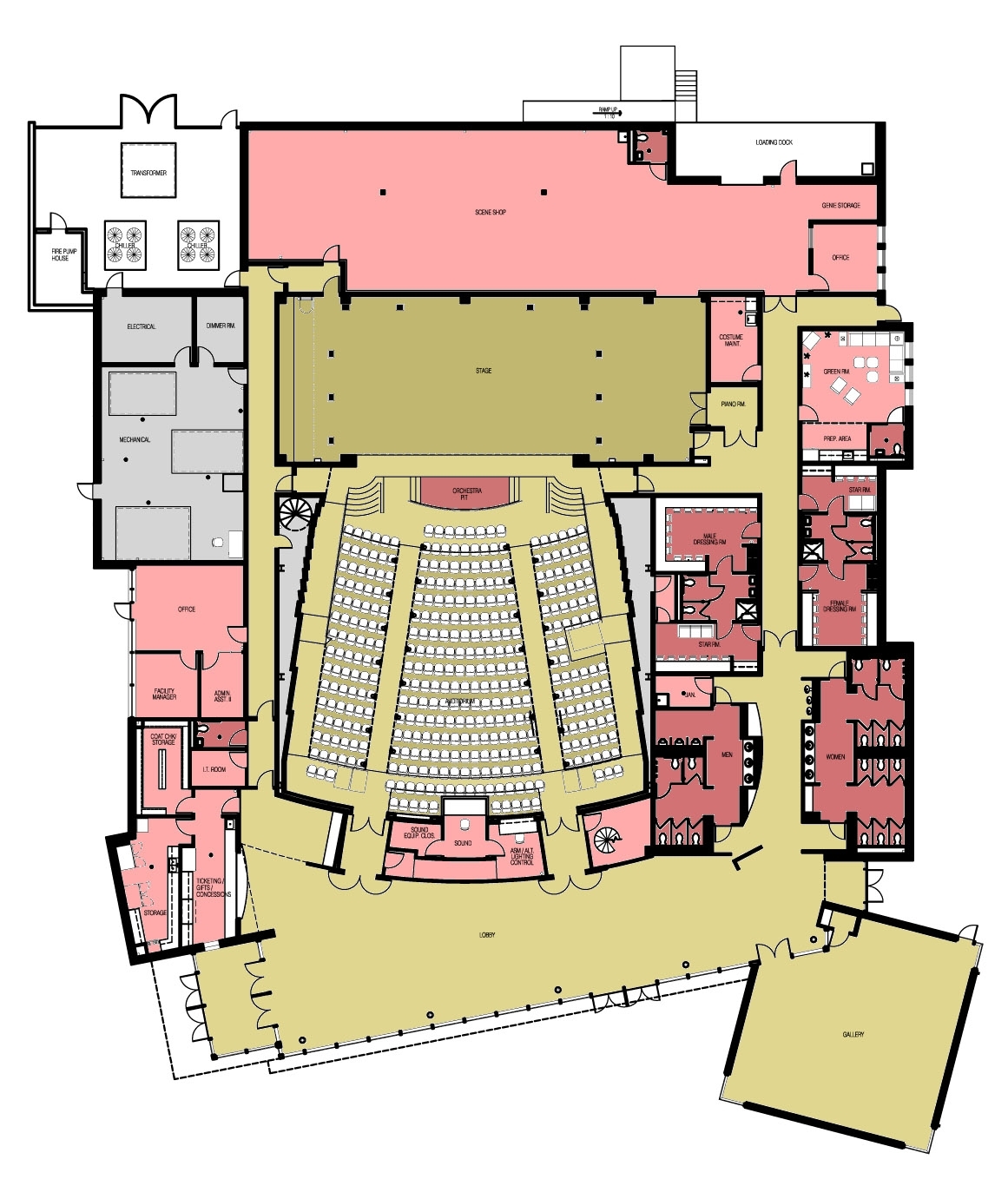 pit, art gallery, box office and concessions area, dressing rooms, a
